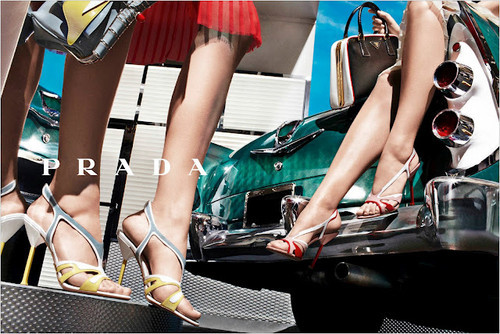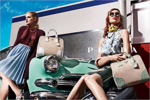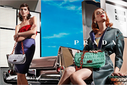 A Prada para esta nova estação quente lançou a sua nova linha da coleção primavera verão 2012 de uma forma original, irreverente e completamente distinta de todas as outras marcas. Os tons pastéis estão por tudo o que é cor, o efeitos das rendas até nas malas está presente, os cortes rectos, as flores salientam-se em padrões tanto nas saias, camisas, lenços como nos próprios bikinis. O pormenor das sandálias nas modelos com efeitos de chamas, assim como aparece esse efeito em alguns carros em cenário de fundo, vem contradizer um pouco o estilo clássico e formal que as modelos apresentam. Aqui podemos considerar que é o catálogo onde tudo aparece, a marca não quis retirar destaque a nenhum estilo nem a nenhuma cor. Ora descontraído, ora formal, ora simples, ora cheia de padrões diferentes. A tendência é sem dúvida os pormenores XXL, já não importa o tamanho da mala, nem dos acessórios..mas sim, o pormenor em si que se torna único e 100% original.