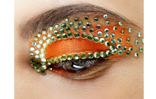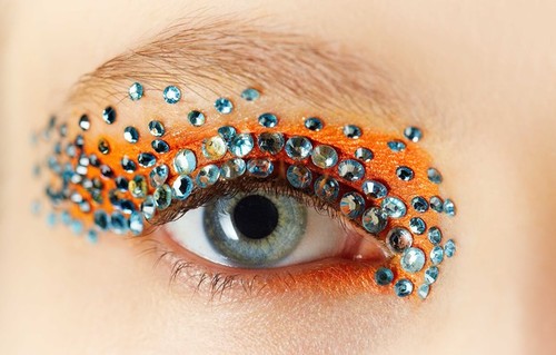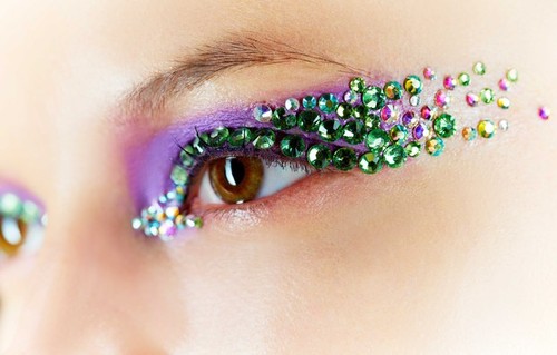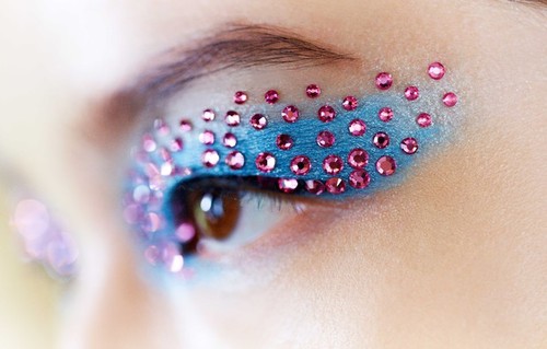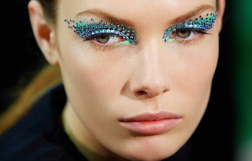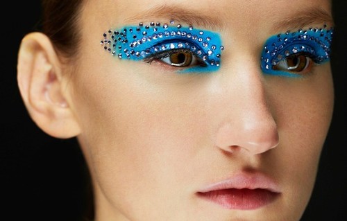 "Este look Techno Butterfly acentua os olhos com grandes pinceladas geométricas de cores intensas, consteladas de explosões de cristais Swarovski tom sobre tom ou constrastantes", explicou a maquilhadora Pat McGrath."