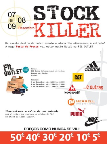 A Stock Killer está de volta e com muitas novidades. Mesmo a tempo do Natal, a festa de preços da Stock Killer associa-se pela primeira vez à FIL Outlet e torna-se um verdadeiro evento dentro de outro com excelentes oportunidades para todos os que visitarem o pavilhão 3 da FIL nos dias 7, 8 e 9 de Dezembro.